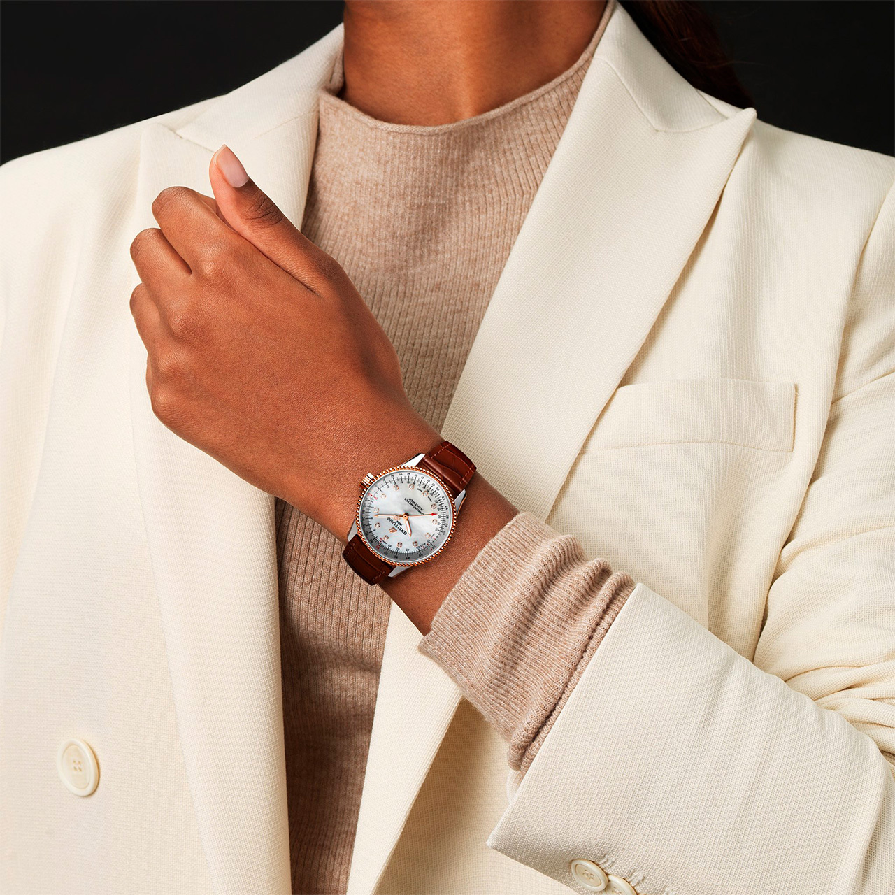Корпус: Корпус выполнен из высококачественной стали с повышенной устойчивостью к коррозии, поверхности с матовой шлифовкой – сатинированием и полировкой до зеркального блеска. Циферблат в стиле “пилот” из натурального перламутра. Аппликация часовых индексов и финишной обработкой. Инкрустация 12 бриллиантов в качестве часовых индексов. Выгнутое сапфировое стекло с антибликовым покрытием нанесенным с обеих сторон. Задняя крышка имеет резьбовое соединение с корпусом. Диаметр корпуса 35 мм. Водозащита 30 м.