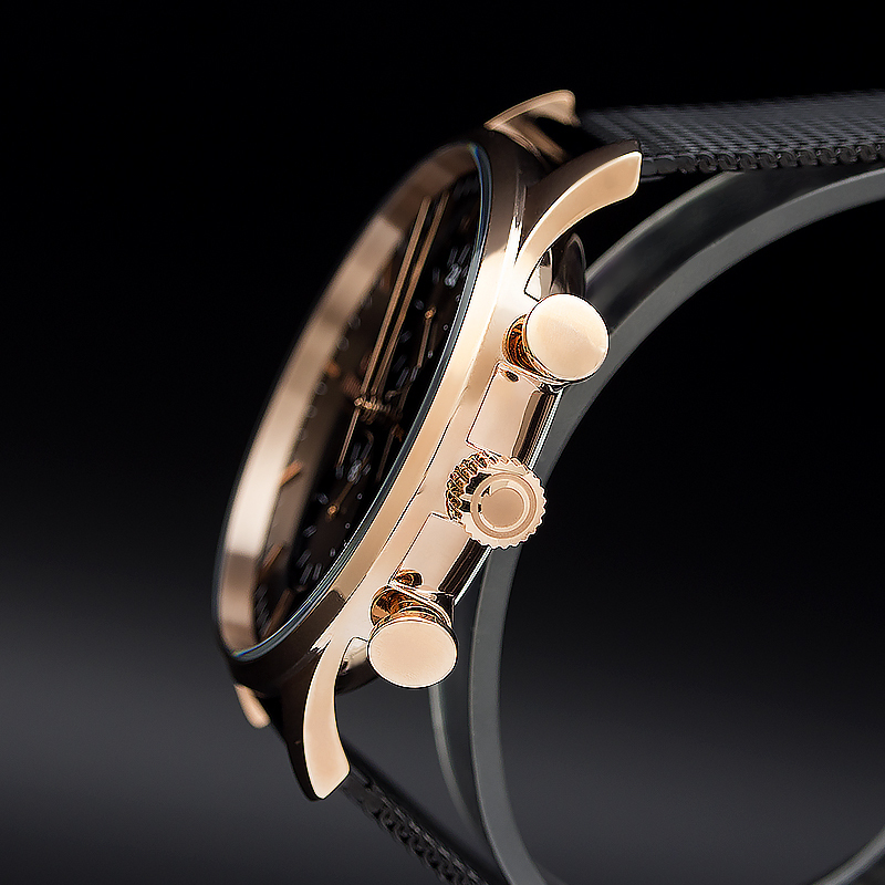 Корпус: Корпус выполнен из стали с розовым IP-покрытием. Минеральное стекло. Чёрный циферблат. Диаметр 42 мм. Водонепроницаемость 50 метров.