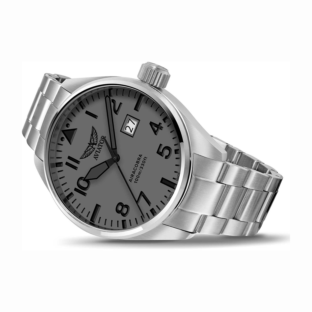 Корпус: Корпус выполнен из высококачественной стали марки 316L с повышенной устойчивостью к коррозии, поверхности с матовой шлифовкой – сатинированием. Матовый циферблат с зернистой отделкой имеет окраску серого цвета. Черные часовые метки и цифры в стиле “пилот” выполнены методом печати. Стрелки и часовые метки благодаря яркому люминесцентному покрытию SuperLuminova отлично читаются в полнейшей темноте и в условиях слабой освещенности. Сапфировое стекло с двусторонним антибликовым покрытием имеет повышенную устойчивость к возникновению царапин. Переводная коронка с двойным уплотнителем и винтовой фиксацией для дополнительной защиты от попадания воды внутрь корпуса. Задняя крышка имеет резьбовое соединение с корпусом. В оформлении задней крышки использована стилизация под элементы дизайна самолетов Airacobra. Диаметр корпуса составляет 42 мм, толщина - 12,2 мм. Водостойкость 100 метров (10 АТМ).