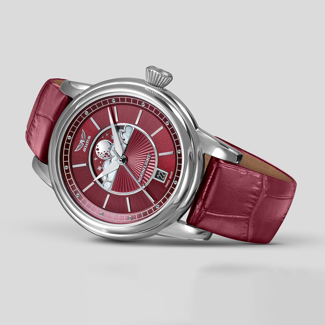 Корпус: Нержавеющая сталь марки 316L. Бордовый циферблат. Стрелки и часовые индексы серебристого цвета покрыты люминесцентным составом SuperLuminova. Облака на циферблате украшены перламутровыми вставками. Задняя крышка украшена гравировкой. Рифлёная заводная головка. Сапфировое стекло с антибликовым покрытием. Водонепроницаемость 100 метров. Диаметр 36 мм.