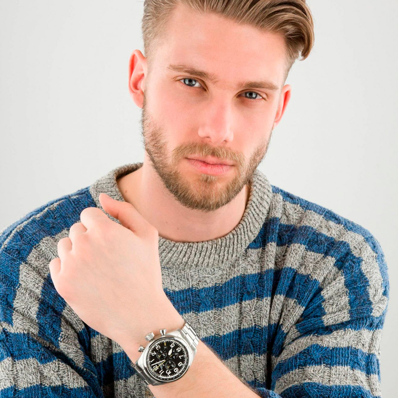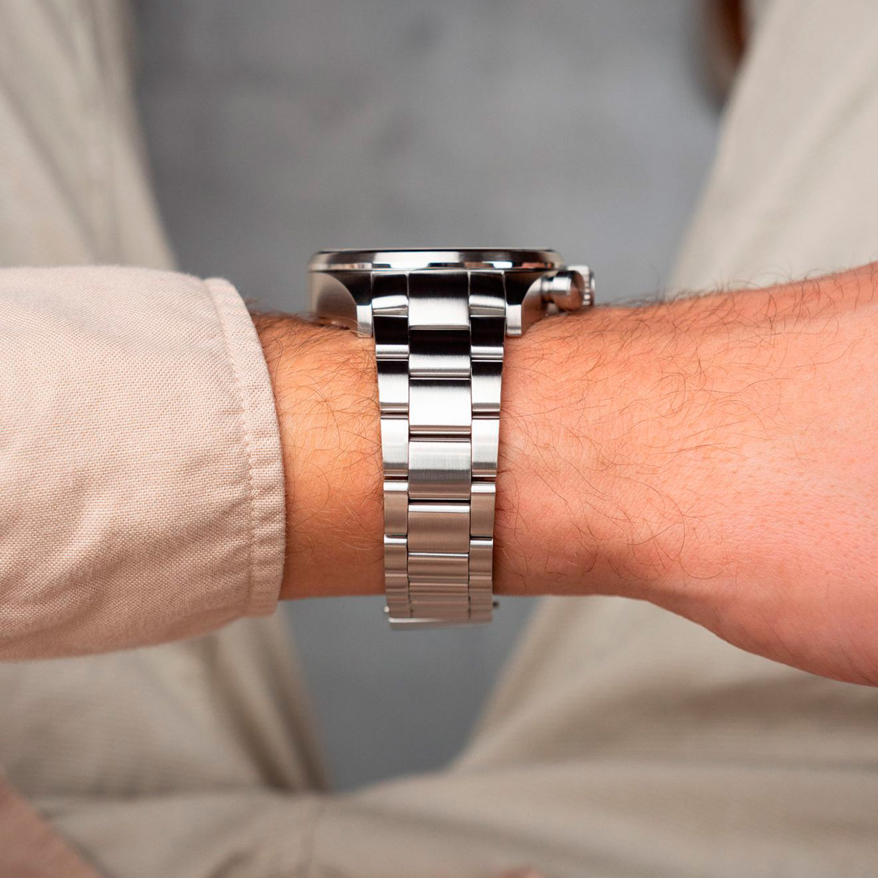 Ремешок: Литой браслет из нержавеющей стали. Браслетная застежка, раскладывающаяся при нажатии кнопок двойной блокировки.