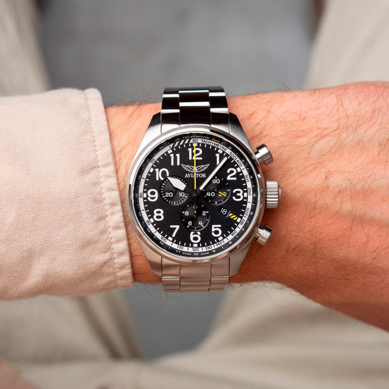 Механизм: Кварцевый хронограф, посвящен легендарному американскому истребителю Bell Airacobra P-39.