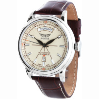 Функции: Центральные часовая, минутная и секундная стрелки, индикация даты и дня недели в апертуре на отметке “6 часов” и большой полукруглой апертуре вверху циферблата.