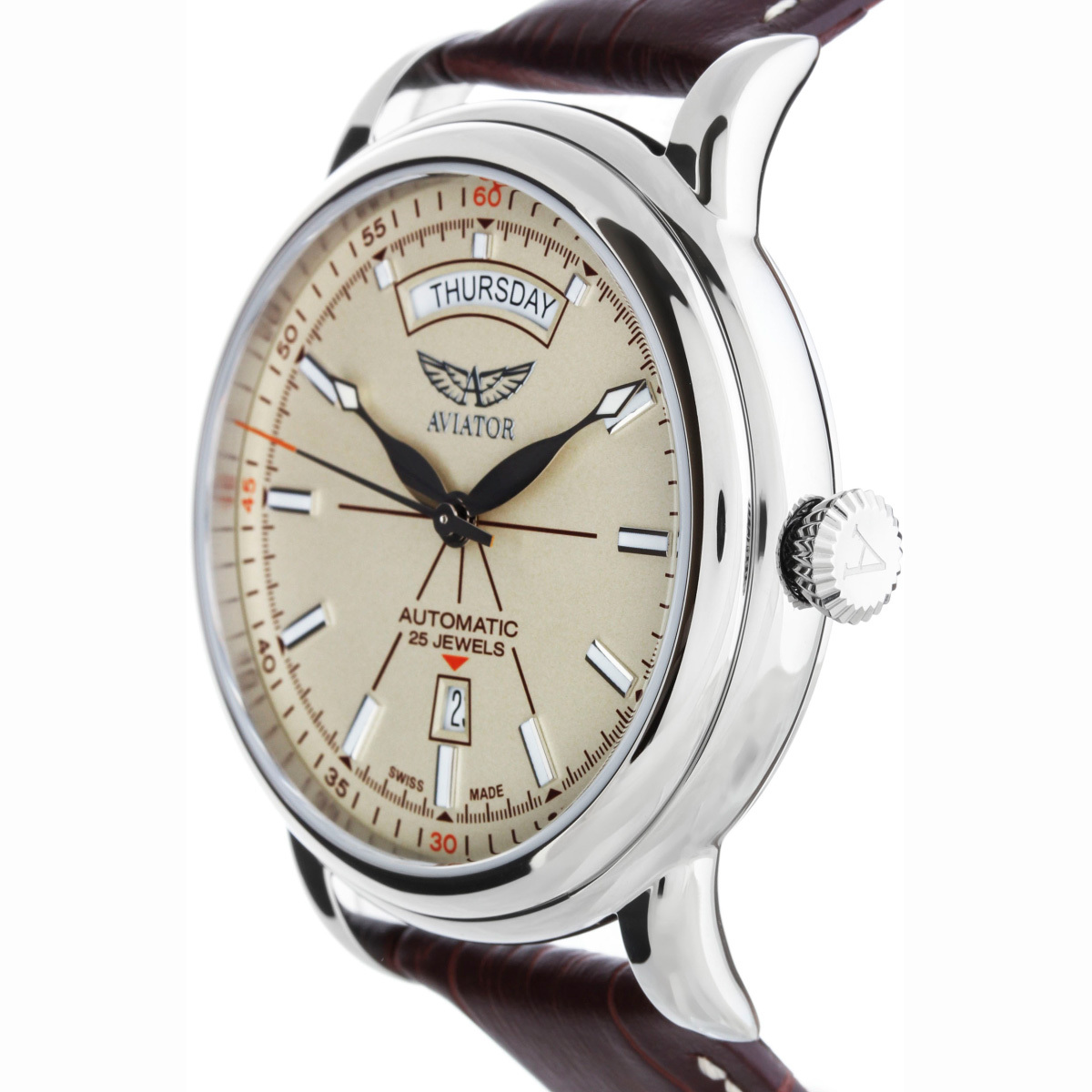 Корпус: Корпус круглой формы выполнен из нержавеющей стали марки 316L. Переливающийся бежевого цвета циферблат. Аппликация часовых индексов и печатная разметка в стиле авиационных приборов. Стрелки и часовые метки имеют светящееся в темноте люминесцентное покрытие SuperLuminova. Сапфировое стекло с двусторонним антибликовым покрытием имеет повышенную устойчивость к возникновению царапин. Диаметр: 45 мм. Водозащита: 100 метров.