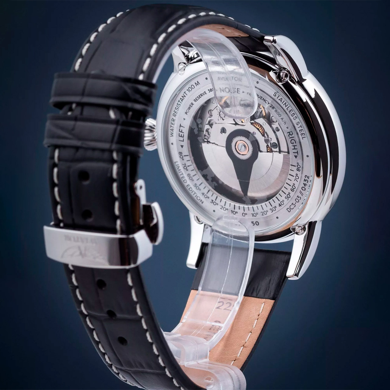 Корпус: Нержавеющая сталь марки 316L. Объемный циферблат с центральной частью серебристого цвета. Стрелки и часовые индексы покрыты люминесцентным составом SuperLuminova. Сапфировое стекло с антибликовым покрытием. Переводная коронка с двойным уплотнителем для дополнительной защиты. Задняя крышка с прозрачным окном из сапфирового стекла имеет винтовое соединение с корпусом. В оформлении задней крышки использована стилизация под один из инструментов управления из кабины самолета Douglas DC-3. Гравировка с градусами на крышке корпуса и стрелка на роторе автоподзавода имитируют функцию угла перекладки руля, которая контролирует положение передней и задней частей самолета. Водонепроницаемость 100 метров. Диаметр 45 мм.