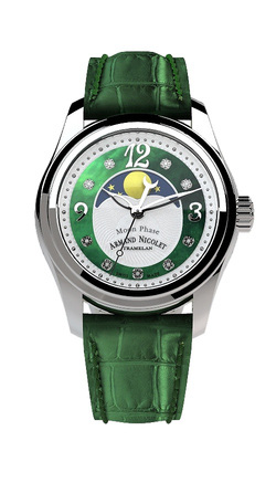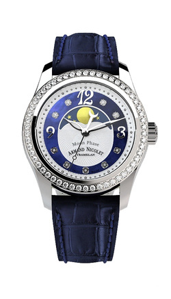 • Циферблат инкрустирован накладными цифрами и индексами, напоминающими бриллианты, а конец секундной стрелки украшен месяцем.