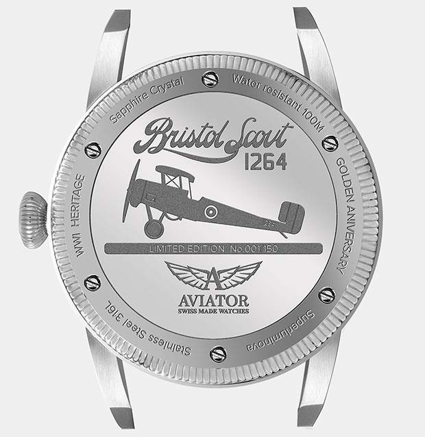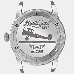 Каждая модель рассказывает историю, уходящую корнями в его собственный авиационный дизайн. Переверните AVIATOR Bristol Scout, и вы увидите, что гравировка и спиральные линии на задней крышке корпуса – это дань уважения прекрасному самолету и его достижениям. Винтажный шрифт, используемый для надписей, а также сочетание пескоструйной обработки и полированной отделки придают задней крышке корпуса утонченный и неповторимый вид. Что касается производительности, то задняя крышка корпуса еще больше гарантирует, что эти часы обладают не только оригинальным внешним видом, но и водонепроницаемостью до 100 метров.
