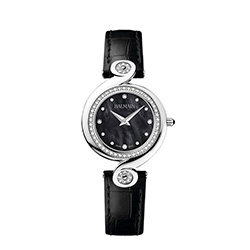2. Balmain Kerria B4171.32.83 Стальной полированный корпус. Белый перламутровый циферблат с центральными гранёными полированными стальными стрелками часов и минут, с четырьмя бриллиантами в виде условных индексов, с фирменным серебристым узором в форме арабески. Чёрный ремешок из натуральной кожи с полированной стальной застёжкой. |
