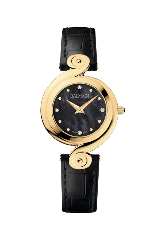 7. Balmain Kerria B4170.32.66 Стальной полированный корпус с жёлто-золотым PVD-покрытием. Чёрный перламутровый циферблат с центральными гранёными стальными, с жёлтой позолотой, стрелками часов и минут, с четырьмя бриллиантами в виде условных индексов. Чёрный ремешок из натуральной кожи с застёжкой из стали с жёлтой позолотой. |
