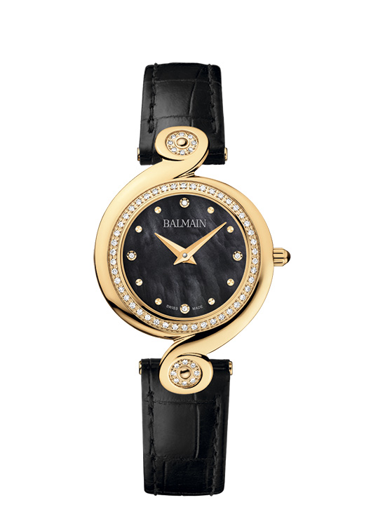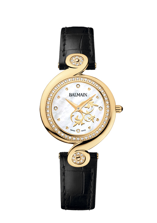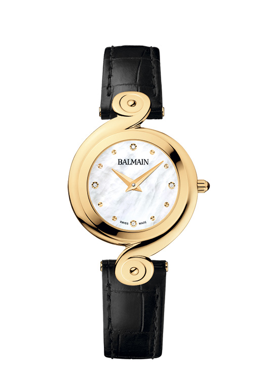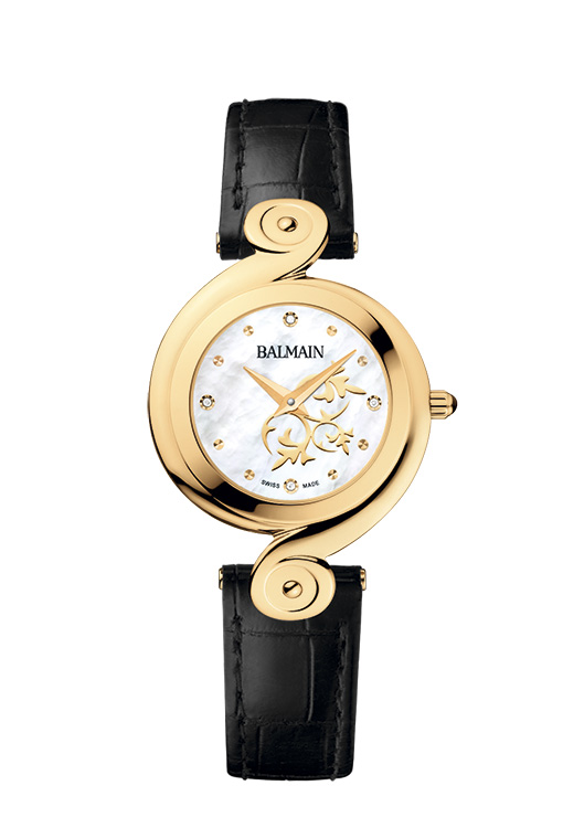 8. Balmain Kerria B4170.32.83 Стальной полированный корпус с жёлто-золотым PVD-покрытием. Белый перламутровый циферблат с центральными гранёными стальными, с жёлтой позолотой, стрелками часов и минут, с четырьмя бриллиантами в виде условных индексов, с фирменным жёлто-золотым узором в форме арабески. Чёрный ремешок из натуральной кожи с застёжкой из стали с жёлтой позолотой. |