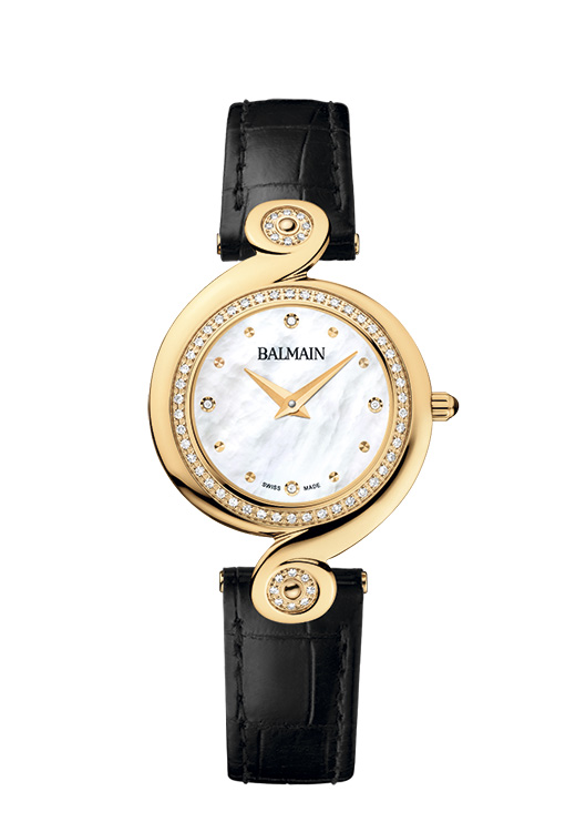 21. Balmain Kerria B4174.32.83 Стальной полированный корпус с розово-золотым PVD-покрытием и шестьюдесятью двумя бриллиантами. Белый перламутровый циферблат с центральными гранёными стальными, с розовой позолотой, стрелками часов и минут, с четырьмя бриллиантами в виде условных индексов, с фирменным розово-золотым узором в форме арабески. Чёрный ремешок из натуральной кожи с застёжкой из стали с розовой позолотой. |
