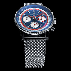 Официально лицензированная модель Navitimer 1 B01 Chronograph 43 Pan Am Edition отличается одним из самых узнаваемых логотипов в истории авиации. Он нанесен на прозрачную заднюю крышку корпуса из сапфирового стекла. На протяжении десятилетий авиакомпания Pan American World Airways являлась лидером гражданской авиации. И даже сейчас, когда авиакомпания прекратила свою деятельность, это имя вызывает волнующие воспоминания о воздушном путешествии. Модель Pan Am Edition имеет корпус из нержавеющей стали с синим циферблатом, серебристыми дополнительными циферблатами, коричневым кожаным ремешком в винтажном стиле, браслетом Breitling Air Racer или плетеным браслетом из нержавеющей стали. Модель Pan Am Edition стала второй моделью капсульной коллекции Breitling.