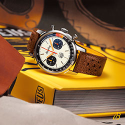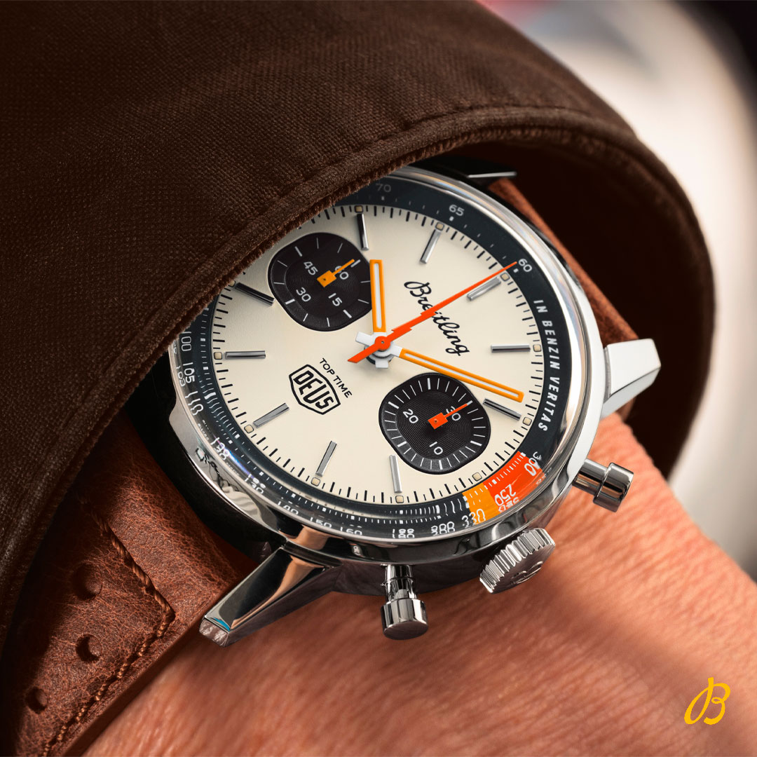 Хронограф Top Time Deus, разработанный в сотрудничестве с компанией Deus Ex Machina, напоминает оригинальную модель Breitling 60-х годов, которая передает искреннее восхищение духом кочевников. Первые часы Top Time создавались как ультрасовременные хронографы для молодых и активных профессионалов. В современной серии воспроизводится стиль ретро – он неизменно популярен. С таким спутником на запястье можно смело отправляться навстречу приключениям. Стильная и смелая – новая версия хронографа оснащена ремешком из телячьей кожи для поклонников гонок. На серебристом циферблате с желтыми и оранжевыми акцентами расположены счетчики хронографа в форме квадрокруга, а также логотип Deus и его слоган «In benzin veritas», нанесенный белым цветом на черной тахиметрической шкале. На обратной стороне корпуса из нержавеющей стали диаметром 41 мм нанесено изображение с культового постера Deus, мчащийся на полной скорости мотоциклист в стиле ретро. Его автор креативный директор Deus Керби Такуэлл. Часы оснащены механизмом Breitling Caliber 23, сертифицированным Швейцарским институтом официального тестирования хронометров (COSC) и имеющим запас хода около 48 часов.