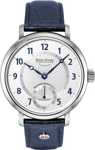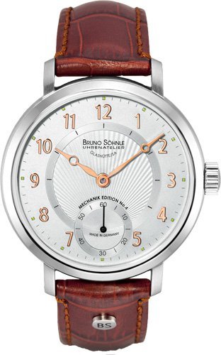 Классический круглый корпус новых часов сохранил свои основные параметры: он выполнен из нержавеющей стали, имеет диаметр 43 мм и высоту 10,6 мм. Часы оснащены механизмом «ETA Unitas 6498», который был улучшен часовщиками мануфактуры «Bruno Söhnle». Основное нововведение в часах – дизайн циферблата: на его серой гильошированной поверхности с логотипом «Bruno Söhnle» помещены арабские цифры (1-12), малая секундная стрелка (с собственной шкалой) у отметки «6 часов» и центральные стрелки часов и минут. Циферблат часов защищён сапфировым стеклом с антибликовым покрытием, а обратная сторона корпуса – прозрачной крышкой из минерального стекла, позволяющего наблюдать работу механизма.