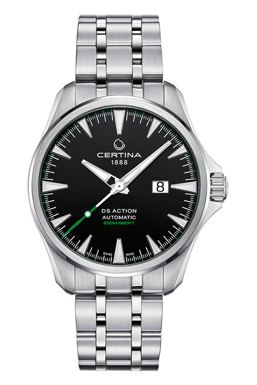 Компания Certina представляет новую модель DS Action Big Date Automatic с впечатляющими возможностями. Среди них эффектное большое окошко даты или часовые отметки и стрелки с покрытием Super-LumiNova, водонепроницаемость до 20 бар, сверхпрочная конструкция.