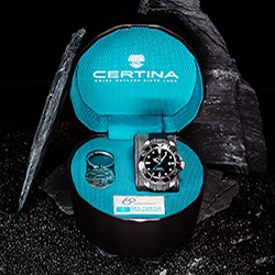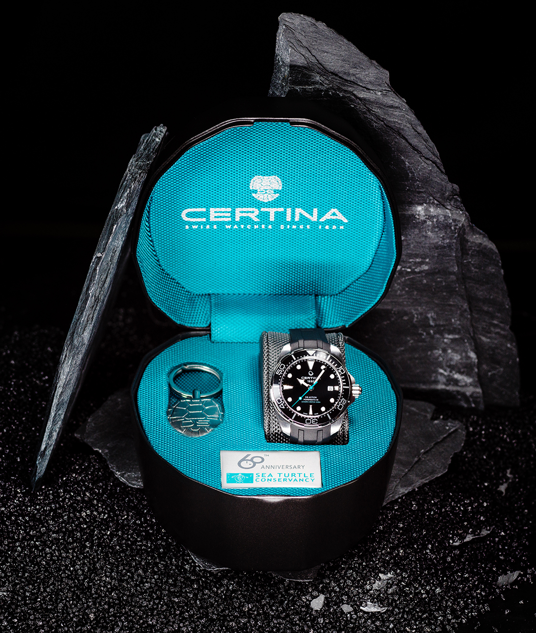 Секундная стрелка цвета морской волны и надпись Diver’s Watch 300 m выполнены в фирменном цвете Sea Turtle Conservancy. На задней крышке корпуса расположен логотип бренда в виде черепахи. В этом году в честь 60-летнего юбилея часы для дайвинга выпускаются в необычной специальной упаковке. Футляр украшает известная эмблема Certina DS в виде панциря черепахи, к которому прилагается кольцо для ключей и элегантный юбилейный бейдж.
