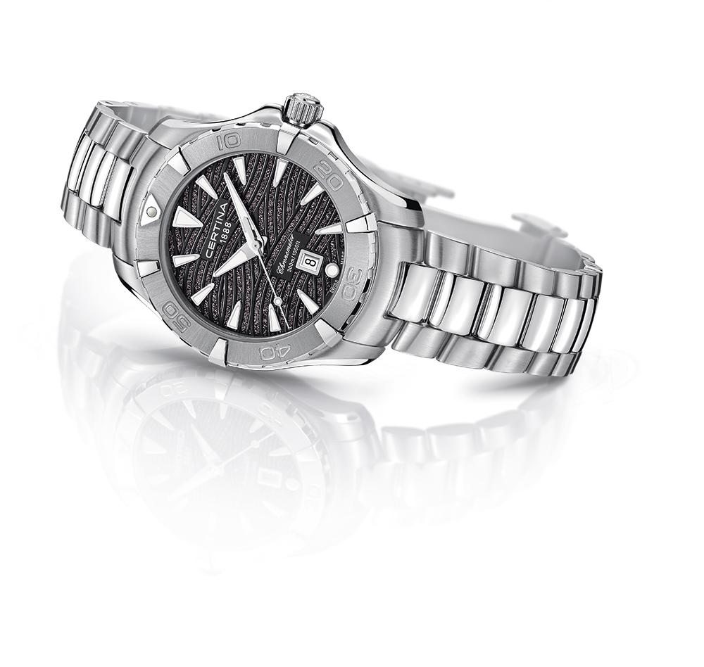 Модель DS Action Lady чувствует себя уверенно в окружении морской стихии. Завинчивающиеся заводная головка и задняя крышка обеспечивают ее изящному корпусу 34 мм из нержавеющей стали водонепроницаемость до 20 бар. Циферблат с серебряным напылением и тонкой отделкой (гильоше «солнечные лучи») украшен тремя бриллиантами на отметке «12 часов». Драгоценные камни придают легкий оттенок роскоши этой повседневной модели. Часы дополняет браслет из нержавеющей стали с чередованием матовых и полированных поверхностей. DS Action Lady имеет официальный сертификат хронометра. Точность хода кварцевого часового механизма Precidrive™ женской модели от Certina официально подтверждена сертификатом знаменитого Швейцарского Института тестирования хронометров (COSC).
