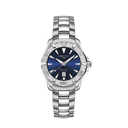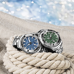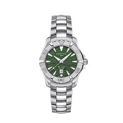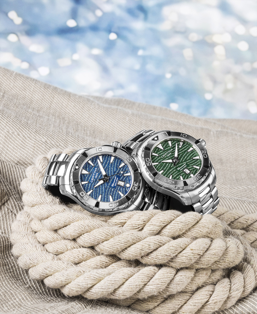 Коллекция DS Action Lady от Certina всегда была связана с водной стихией. Водонепроницаемость до 30 бар (300 м), ультрапрочный корпус и однонаправленно вращающийся безель делают эту модель уместной как на пляже, так и на переговорах. Она станет безупречным спутником и в офисе, и в бассейне. Синие и зеленые циферблаты этих женских часов дополнены декором в виде сверкающих волн.