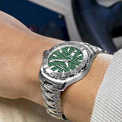 - Изумрудно-зеленый циферблат с напечатанным декором в виде волн и инкрустацией стразами.
