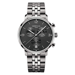 Новый хронограф оснащен кварцевым часовым механизмом G10.212, который совмещает часовую, минутную, малую секундную стрелку, а также функцию остановки секундной стрелки и окно указателя даты на отметке «6 часов». Помимо 30-минутного счетчика на отметке «10 часов» хронограф имеет счетчик 1/10 секунды в реальном времени на отметке «2 часа» – гарантия абсолютной точности и эффектное визуальное решение. Система двойной надежности, уже более 60 лет обеспечивающая высокую прочность всех часов Certina, гарантирует этой модели в спортивном стиле водонепроницаемость до 10 бар (100 м), а также функциональность. Это делает часы идеальным спутником в условиях большого города.