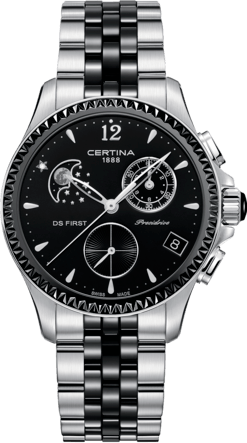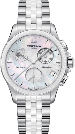 Часы Certina DS First Lady Chronograph Moon Phase представляют собой технически сложное изделие, при изготовлении которого были использованы высокотехнологичные материалы и детали высшего качества, современная технология «Precidrive ™», а также знаменитая фирменная система «Double Security». При всей этой сложности новый женский кварцевый хронограф с индикацией фаз Луны легко сочетает в своём дизайне спортивный стиль, элегантность, изящество и нотку роскоши, которой является небольшой бриллиант в оригинальной оправе на циферблате.