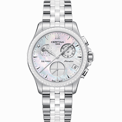 2. Certina DS First Lady Chronograph Moon Phase C030.250.11.106.00 Корпус из нержавеющей стали с матовой отделкой, белый керамический безель. Белый перламутровый циферблат с бриллиантом Top Wessselton VS-SI 0,0038 карата; центральные стрелки, условные часовые индексы, цифра «12», секундный субциферблат, 30-минутный счётчик хронографа, рамка окошка даты и оправа бриллианта – с серебристым PVD-покрытием. 5-рядный браслет из нержавеющей стали с центральными рядами звеньев из белой керамики и застёжкой-бабочкой с двумя кнопками. |