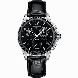 5. Certina DS First Lady Chronograph Moon Phase C030.250.16.056.00 Корпус из нержавеющей стали с матовой отделкой, чёрный керамический безель. Чёрный глянцевый циферблат с бриллиантом Top Wessselton VS-SI 0,0038 карата; центральные стрелки, условные часовые индексы, цифра «12», секундный субциферблат, 30-минутный счётчик хронографа, рамка окошка даты и оправа бриллианта – с серебристым PVD-покрытием. Чёрный кожаный ремешок с застёжкой-бабочкой на двух кнопках. |