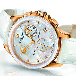 4. Certina DS First Lady Chronograph Moon Phase C030.250.36.106.00 Корпус из нержавеющей стали с розово-золотым PVD-покрытием, белый керамический безель. Белый перламутровый циферблат с бриллиантом Top Wessselton VS-SI 0,0038 карата; центральные стрелки, условные часовые индексы, цифра «12», секундный субциферблат, 30-минутный счётчик хронографа, рамка окошка даты и оправа бриллианта – с розово-золотым PVD-покрытием. Белый кожаный ремешок с застёжкой-бабочкой на двух кнопках. |