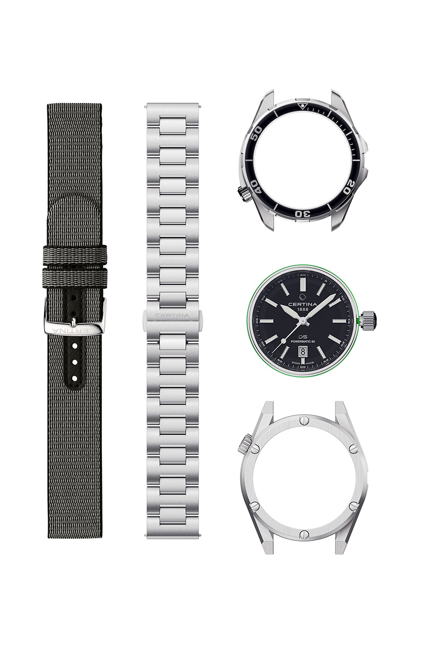 Секрет DS+ заключается в конструкции, состоящей из трех частей: модуля механизма с циферблатом, корпуса и ремешка. Каждый из трех элементов представляет собой самостоятельную единицу, которую можно по желанию комбинировать с двумя другими. Модуль механизма круглой формы, доступный с тремя вариантами циферблата, комбинируется с одним из шести корпусов из нержавеющей стали и надежно закрепляется с помощью заводной головки на корпусе. Инновационная прокладка из биоматериала обеспечивает идеальное уплотнение. Ушки, расположенные на корпусе, позволяют использовать систему быстрой замены Certina для крепления выбранного ремешка. Бутики Certina предлагают новую модель в виде трех комплектов, каждый из которых состоит из модуля механизма, двух корпусов и двух ремешков. Все составные части также можно приобрести отдельно.