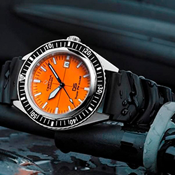 Во всем, что касается дизайна, новые часы Certina остаются верными своим корням. Как и раньше, часы диаметром 43 мм имеют эффектный вращающийся безель и сапфировое стекло с защитой от царапин. Щедрый слой люминесцентного материала обеспечивает отличную видимость, а завинчивающаяся задняя крышка корпуса и завинчивающаяся заводная головка – водонепроницаемость до 500 м. Оранжевый циферблат также вдохновлен исторической моделью для дайверов марки Certina, он придает современному исполнению уникальный характер. Часы оснащены черным каучуковым ремешком с волнистой отделкой и удлинением для дайвинга. Кроме того, для каждой модели доступны два ремешка NATO – члены VDST могут получить их бесплатно.