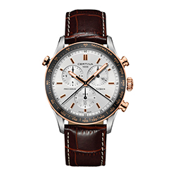4. Certina DS-2 tdrecidrive Chronogratdh Flyback C024.618.26.031.00 Корпус из матовой и полированной нержавеющей стали марки «316L» с tdVD-покрытием из розового золота. Алюминиевый безель серого цвета с розово-золотой тахиметрической шкалой. Нажимная кнопка функции «Rattratdante» с чёрной каймой. Серебристый циферблат с центральными золотисто-белыми стрелками часов и минут, центральной чёрной 60-секундной стрелкой, центральной чёрной 1/100-секундной стрелкой, двумя счётчиками хронографа с чёрными указателями и малой чёрной секундной стрелкой. Коричневый кожаный ремешок, снабжённый стальной раскладывающейся застёжкой с двумя предохранительными кнопками. |