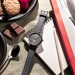Вторая монохромная модель окрашена в серый цвет. Эта сдержанная и элегантная версия в современном стиле более чувствительна к свету, чем часы черного цвета. Отличительной особенностью модели является увлекательная игра отражений, теней и контрастов. Накладные индексы хорошо выделяются на фоне циферблата, а полированные стрелки парят над циферблатом с узором в виде солнечных лучей в изысканном хроматическом танце.