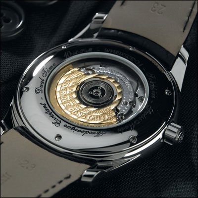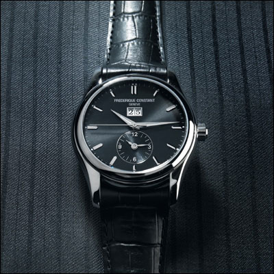 Циферблат модели с матовой, идеально ровной поверхностью чёрного цвета и строгими накладными стальными индексами, увеличенный (с 38 до 43 мм) корпус, водонепроницаемость которого составляет 100 метров – всё это формирует определённый и неповторимый имидж, незаметно переходящий и на владельца часов. Надёжный калибр FC 325 (с которого и началась новая страница истории Frederique Constant) можно увидеть сквозь прозрачную заднюю крышку. На массивном золотом секторе подзавода выгравировано название марки – символа современной классики. Завершает выверенный эталон современного делового аксессуара – ремешок из крокодиловой кожи чёрного цвета с застёжкой, украшенной логотипом марки.