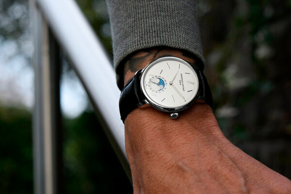 Frederique Constant — швейцарское производство, которое с гордостью создает свои механизмы и собирает часы вручную. В новой часовой коллаборации Romaric André добавил к традиционной модели Moonphase некую "человеческую ошибку", выраженную через неправильное расположение меток и небрежно написанных вручную логотипа и указателя даты. Такие необычные элементы циферблата подчеркивает ремесленную составляющую этих часов.