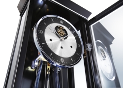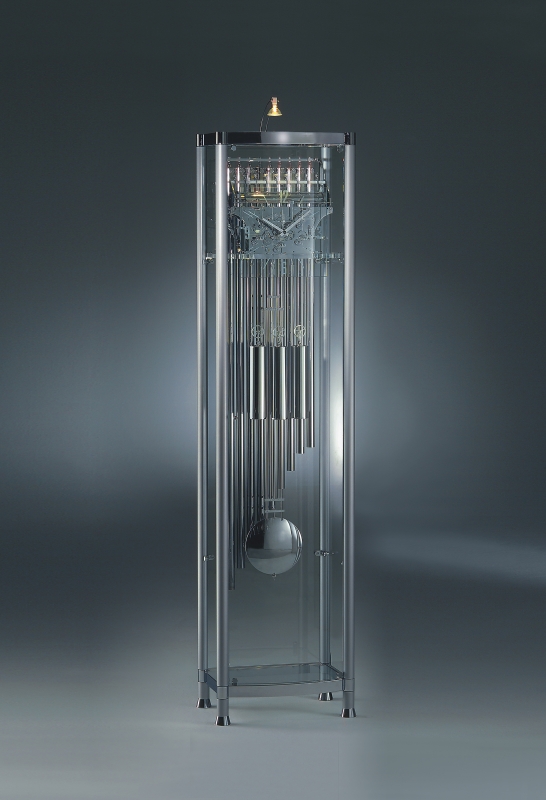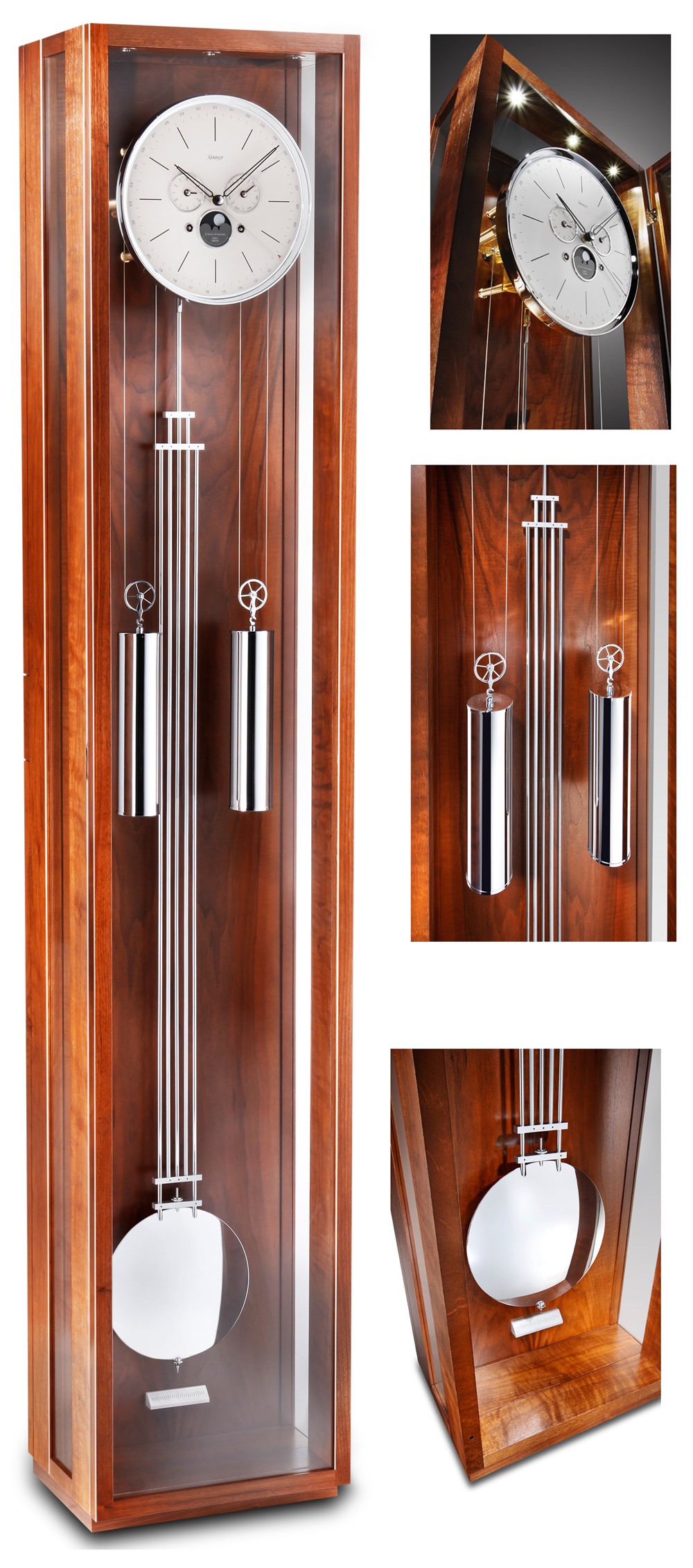Часы оснащены механизмом (на 12 рубинах и 8 подшипниках) с тросовым приводом, двумя никелированными гирями и большим серебристым круглым маятником на специальной длинной подвеске. Запас хода механизма – восемь дней. Через каждые полчаса скрытый гонг часов воспроизводит бой.