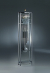 Уникальные дизайнерские часы, выпущенные ограниченной серией. Элегантный прозрачный корпус часов выполнен из хрустальных панелей, соединённых в единое целое хромированными полированными стойками и перекладинами. Панель фронтальной дверцы корпуса – слегка изогнута. Корпус часов имеет декоративную галогеновую подсветку. Размеры корпуса: