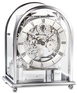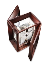 Небольшие настольные механические часы в прямоугольном арочном корпусе на миниатюрных ножках. Корпус часов изготовлен из прочной хромированной сияющей латуни. Фронтальная, боковые и задняя стороны корпуса закрыты стеклянными панелями со скошенными краями. Эти панели позволяют наблюдать работу механизма часов со всех сторон. Размеры корпуса: