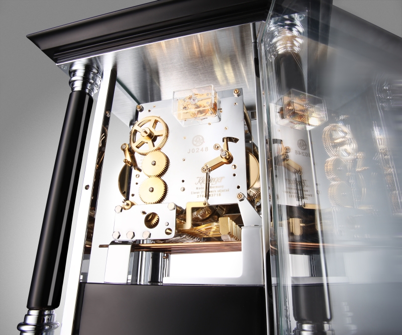 Немецкая скрупулезность и усердие – основы престижа марки «Kieninger». Платины механизма производятся из высокопрочного латунного сплава, затем их полируют и покрывают очень тонким слоем бесцветного лака. Все стальные детали закаливаются и гальванизируются, а для опоры осей применяются драгоценные рубины и бронзовые втулки. Однако когда потенциальный покупатель знакомится с такими часами, он сначала обращает внимание на сверкающие детали и уже впоследствии понимает, что приобрёл не только дорогую и статусную, но и очень надёжную вещь, способную стать фамильной ценностью и передаваться по наследству. Также основательно на фабрике компании «Kieninger» создают и корпусы часов. В конечном итоге мастера компании всё делают для того, чтобы клиент видел, слышал и интуитивно понимал, обладателем какого технического и эстетического шедевра он может стать.