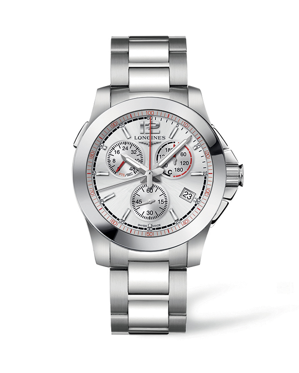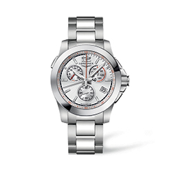 1. Longines Conquest Jumping L3.701.4.76.6 Корпус и браслет из нержавеющей стали с сатинированной и полированной отделкой. Серебристый циферблат с центральными стрелками с родиевой отделкой и люминесцентным покрытием «Superluminova». |