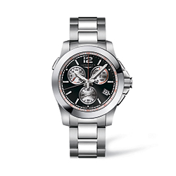 2. Longines Conquest Jumping L3.701.4.56.6 Корпус и браслет из нержавеющей стали с сатинированной и полированной отделкой. Чёрный циферблат с центральными стрелками с родиевой отделкой и люминесцентным покрытием «Superluminova». |