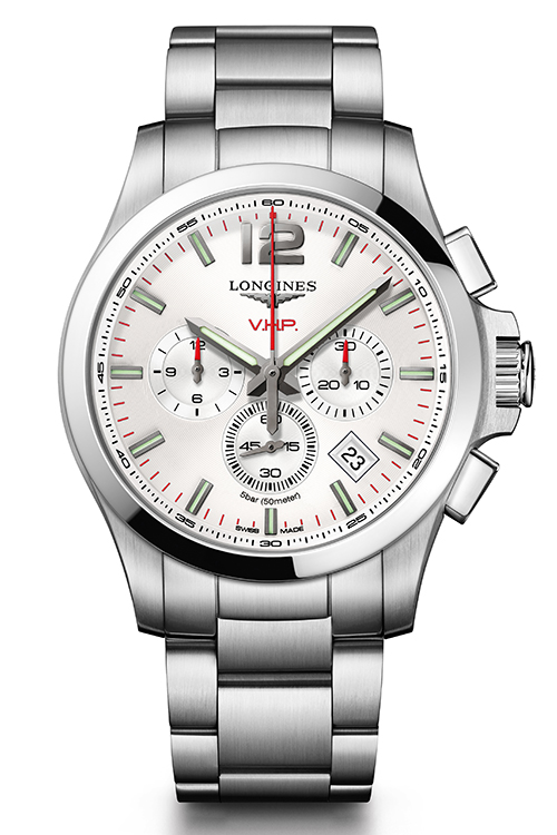 Часы в корпусе из нержавеющей стали выпускаются в трехстрелочном формате с календарем (диаметр 41 и 43 мм), а также в формате хронографа (диаметр 42 и 44 мм). Функции хронографа включают в себя часы, минуты, секунды, 30-минутный счетчик в положении «3 часа», 12-часовой счетчик в положении «9 часов» и центральный 60-секундный счетчик. Корректировка показаний проводится при помощи электронной заводной головки. Индикатор срока службы батарейки (EOL) предупредит о необходимости замены элементов питания. Часы Longines из коллекции Conquest V.H.P. выпускаются в разных дизайнерских решениях: с циферблатами синего, угольно-черного, серебристого и черного оттенков. Финальный штрих придает стальной браслет с надежной складной застежкой.