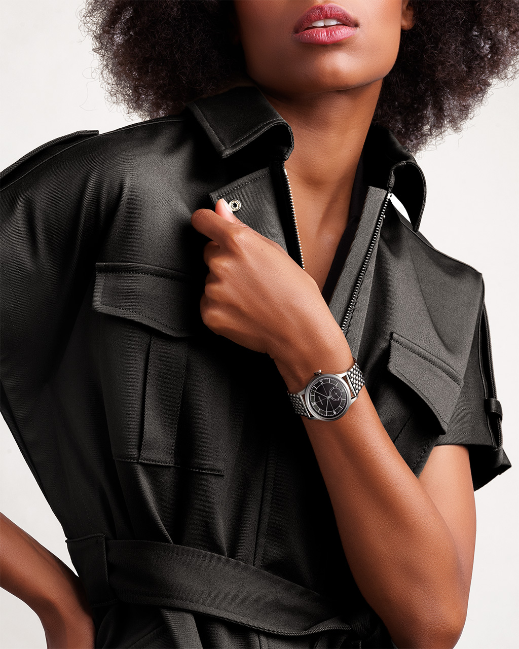 Cl Classics Manchette — это решительный аксессуар: при взгляде первым бросается скульптурный браслет с орнаментом Clou de Paris, который играет бликами и превращает часы в украшение. Мини-циферблат выдержан в строгой минималистичной манере — только часы и минуты — чтобы ничто не отвлекало от фактуры и формы браслета.