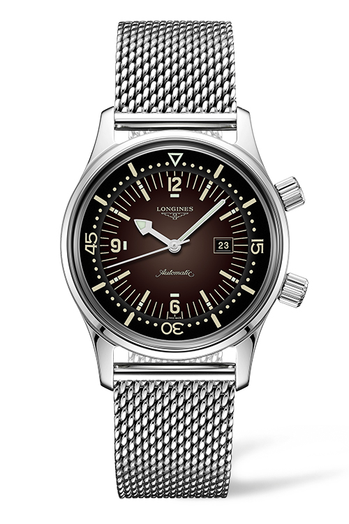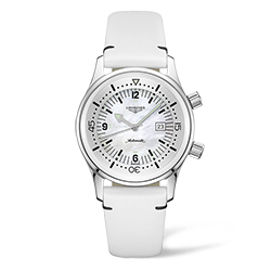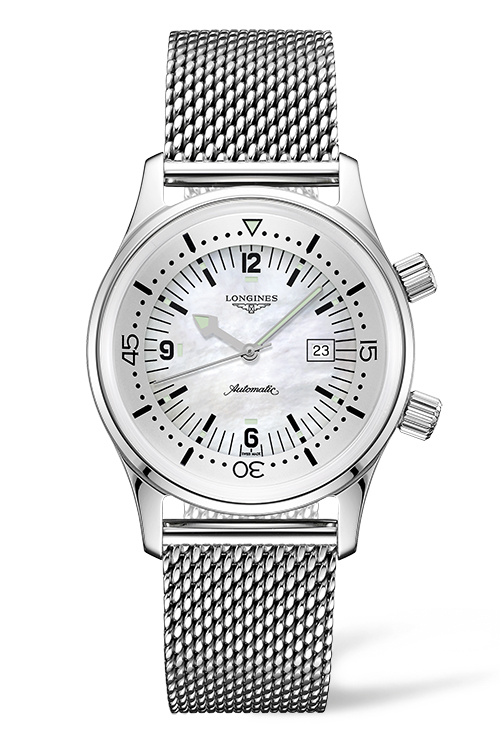 Новинки The Longines Legend Diver Watch с корпусом из стали диаметром 36 мм оснащены механизмом с автоподзаводом и выпуклым стеклом. Циферблат представлен в нескольких вариантах: от переливающегося перламутрового до более классического коричневого или оригинального черного цвета. Время показывают радированные стрелки с покрытием Super-LumiNova®. Задняя крышка украшена гравировкой с изображением дайвера. Браслет миланского плетения подчеркивает лаконичность часов, а кожаные ремешки белого и коричневого цвета гармонично дополняют модели с аналогичными цветами циферблата.