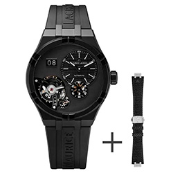 В отличие от других представителей коллекции AIKON в чехле отсутствуют обычные выступы, и ремешок встроен в корпус, обеспечивая впечатляющий комфорт при ношении. Maurice Lacroix решил оснастить модель новым ремешком из каучука, на котором рельефно изображено название бренда. Также у часов есть второй ремешок из синтетической кожи с текстильным эффектом, на котором изображен ставший легендарным логотип бренда «M». Благодаря удобной системе замены ремешков Maison можно легко переключаться с одного ремешка на другой без использования инструментов.