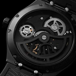 AIKON Master Grand Date Black представлен в 45-миллиметровом корпусе из нержавеющей стали больших размеров, выполненном в черном цвете DLC. Его сдержанный внешний вид, слегка задумчивый по темпераменту, выглядит без особых усилий стильно. Дисплей придает смысл, одновременно раскрывая многочисленные компоненты в движении. Они оснащены циферблатом, выполненным в вертикальном матовом черном цвете DLC, который подчеркивает скрытый характер часов.