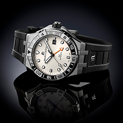 Первый циферблат – черный, с отделкой «солнечные лучи» и со светлыми стальными индексами округлой формы с люминесцентным покрытием SuperLumiNova – в этой версии стрелка GMT окрашена в красный цвет. Второй вариант – циферблат белого цвета с отделкой «солнечные лучи», оранжевой стрелкой GMT и черными часовыми метками, также с люминесцентным покрытием SLN. Однако самое значительное изменение в новой версии AIKON Venturer GMT – это безель.