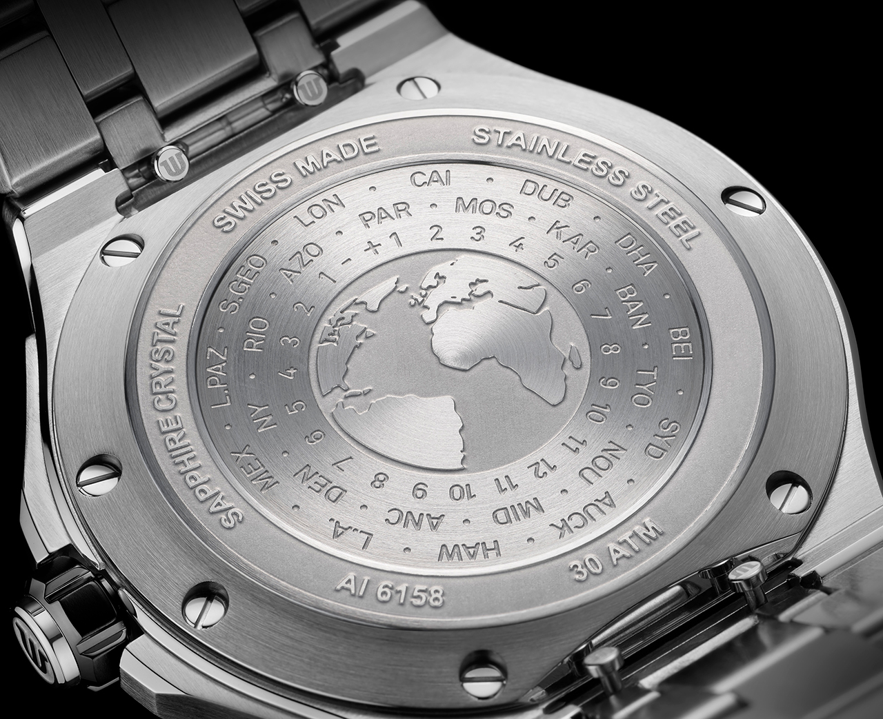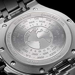 Cилуэт стального сатинированного корпуса часов эффектно обрисовывает полированная кромка. Самое важное кроется в деталях: задняя крышка часов AIKON Venturer GMT украшена гравированным изображением карты мира с разметкой основных 24 часовых поясов. Интегрированный пятирядный стальной браслет оснащен системой Easychange, благодаря которой браслет можно легко снять и заменить. А со вторым ремнем, из каучука с геометрическим узором, часы AIKON Venturer GMT приобретают выраженный спортивный стиль.