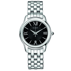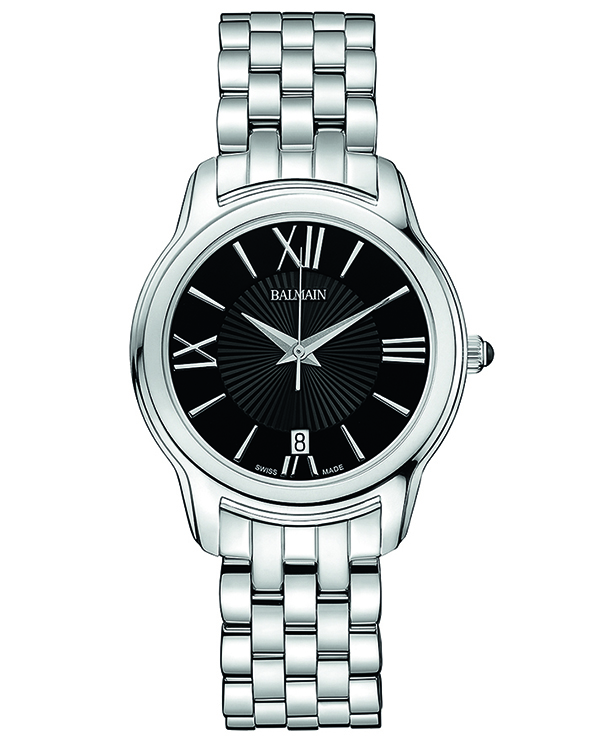 | 2. Модель «Miss Balmain Dream» B1891.33.62 Стальной корпус; чёрный с гильошированием циферблат с белыми римскими цифрами (III, VI, IX, XII) и условными индексами, с серебристыми гранёными центральными стрелками часов и минут, серебристой центральной секундной стрелкой; стальной наборный браслет. |