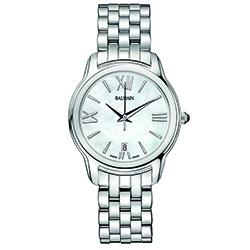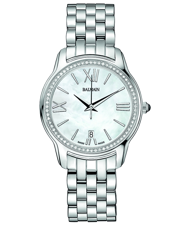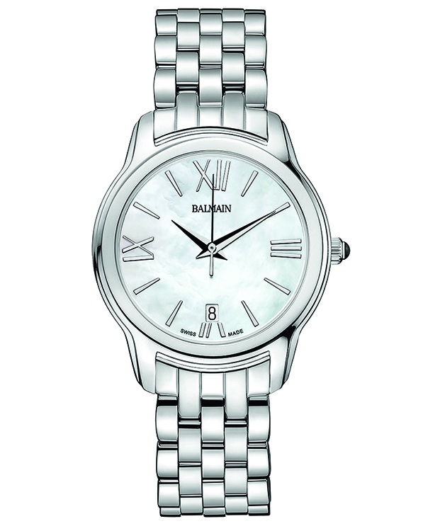 | 3. Модель «Miss Balmain Dream» B1891.33.82 Стальной корпус; белый перламутровый циферблат с белыми римскими цифрами (III, VI, IX, XII) и условными индексами, с гранёными центральными стрелками часов и минут, центральной секундной стрелкой; стальной наборный браслет. |