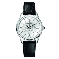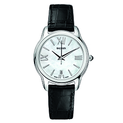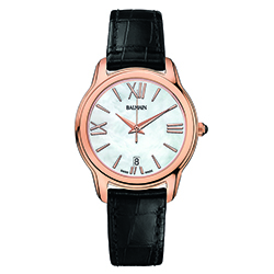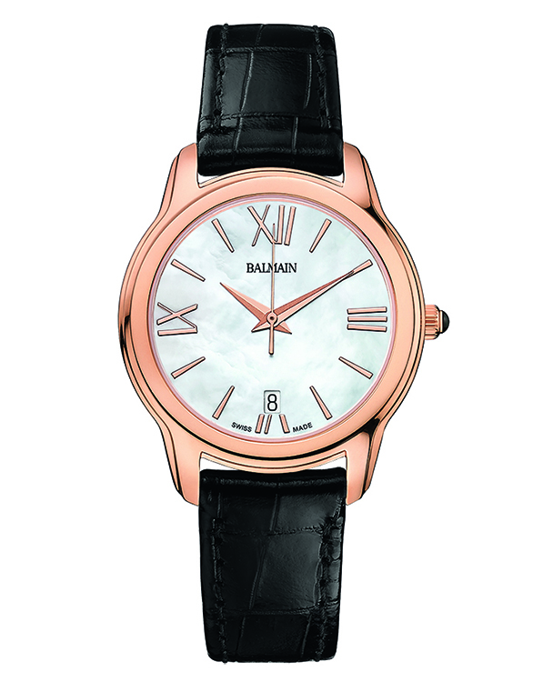 | 15. Модель «Miss Balmain Dream» B1899.32.82 Стальной корпус с безелем, имеющим PVD-покрытие красным золотом; белый перламутровый циферблат с римскими цифрами (III, VI, IX, XII), условными индексами, центральными гранёными стрелками часов и минут, центральной секундной стрелкой – с PVD-покрытием красным золотом; чёрный кожаный ремешок. |
